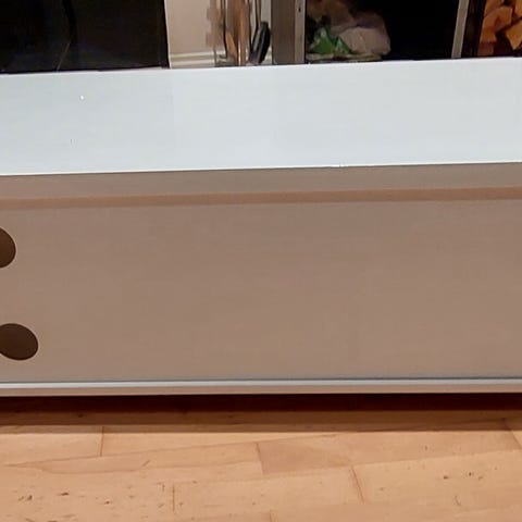 Fin moderne hvit TV Benk. På overflaten er det en glassplate. På baksiden er det kuttet ut hull for ledninger.