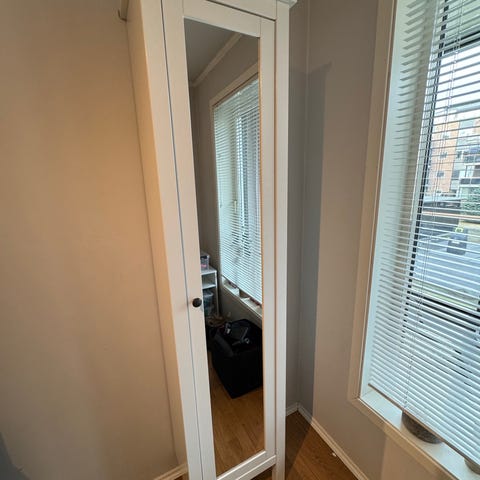 Et fantastisk speil med oppbevaring til bl.a. smykker, muligheten til og også henge det opp på veggen. Følger med nøkler så du får låst skapet, noen skrammer her og der men veldig pen fortsatt
