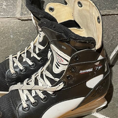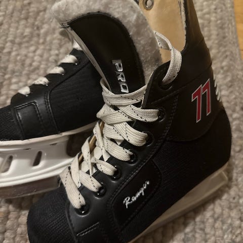 Ranger Pro ishockeyskøyter i størrelse 42. Skøytene har svart overdel med hvite lisser og hvit plastskaft med stålklinge. Egnet til ishockey og generell bruk på is. Passer for brukere som trenger skøyter i størrelse 42.
