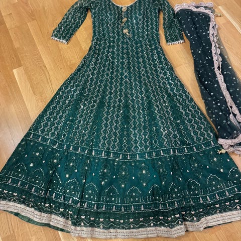 Vero Moda sommerkjole i størrelse M. Kjolen er hvit med blomstrete mønster og er laget av bomull. Modellen har lange ermer med strikk ved håndleddene og lett struktur i stoffet. Passer som lett sommerkjole til hverdagsbruk eller enkle anledninger.