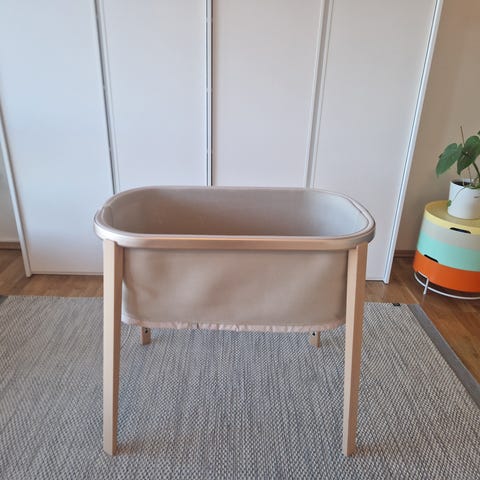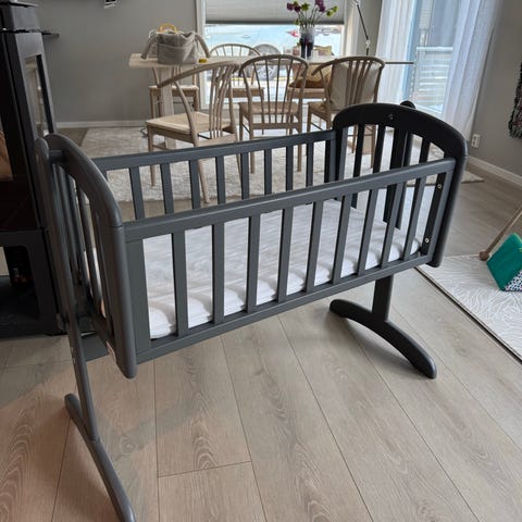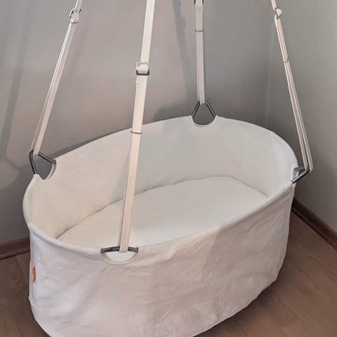 Leander Classic vugge for å henge i taket eller på et stativ. Gynger da i alle retninger. Lengde 83 cm, bredde 50 cm og høyde 30 cm. Med sengehimmel og madrass. Kan sendes mot at kjøper betaler porto. Kan leveres i Trondheim 19.feb.