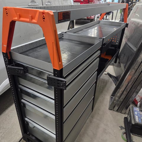 Bilinnredning hylle- og skuffesystem stål grønn/grå