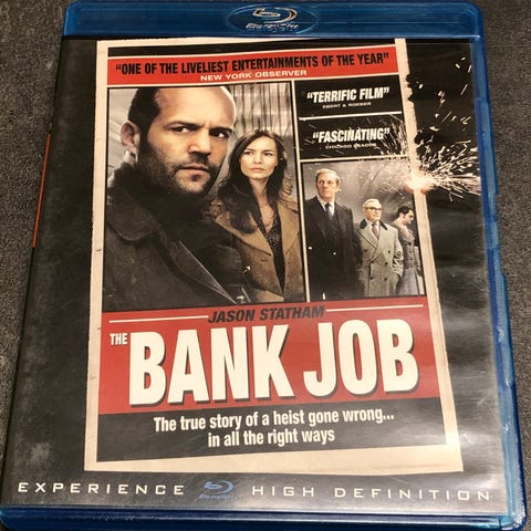 The Bank Job Blu-ray film. Utgave på Blu-ray i høyoppløselig format. Omslaget viser informasjon om filmens handling, med tekst på flere språk, samt tekniske spesifikasjoner som spilletid, lyd- og bildeformat og aldersgrense. Egnet for avspilling på Blu-ray-spillere.