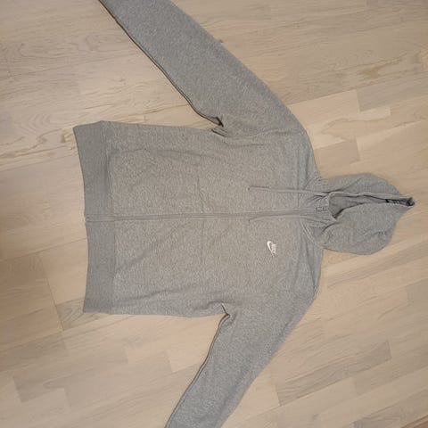 Grå kul hettegenser til gutt str128. Lite hull neders på håndleddet som kan sys.
