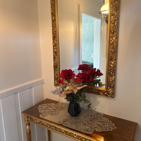 Selger et elegant speil med matchende konsollbord i klassisk, barokk/rokokko stil. Perfekt til entré, stue eller soverom – et blikkfang som gir rommet et eksklusivt preg.