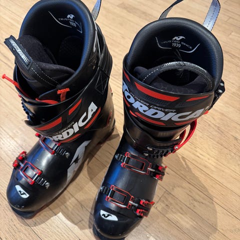 Nordica Dobermann alpinstøvler i størrelse 280–285 mm sålelengde (325 mm). Støvlene er i hovedsak hvite og grå med svarte og røde detaljer. Modellen har fire justerbare spenner i metall og powerstrap øverst for bedre tilpasning rundt leggen. Innerstøvlene er polstret for komfort og støtte. Passer til vanlig alpinbruk i preparerte bakker. Egner seg for brukere som trenger en sålelengde på 325 mm for tilpasning til bindinger.