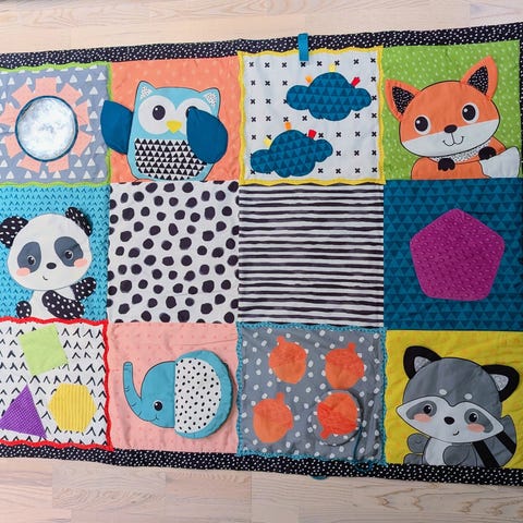 IKEA leketeppe for barn med havmotiv. Teppe i mykt, vattert materiale med lys blå overflate og påsydde figurer som fisk, krabbe og blekksprut. Kvadratisk form som gir god plass til lek og aktivitet på gulvet. Egnet som underlag for baby og småbarn under lek, liggende og sittende aktiviteter.