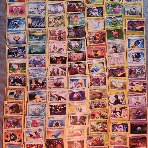 Pokémon samlepakke med ulike samlekort. Kortene har forskjellige motiver, typer og farger, og ser ut til å være fra flere ulike serier og utgivelser.