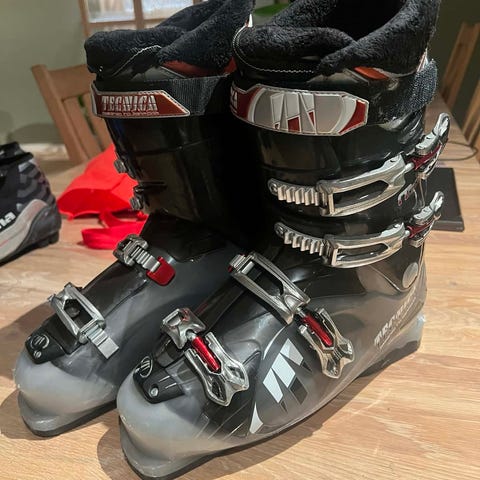 Atomic alpinstøvler i svart/grå farge. Sålelengde er merket 315 mm, og skostørrelse er angitt til 270–275 mm (mondopoint). Støvlene har fire spenner og powerstrap øverst for justering og tilpasning rundt leggen. Passer til bruk i alpinanlegg med standard alpinski-bindinger.