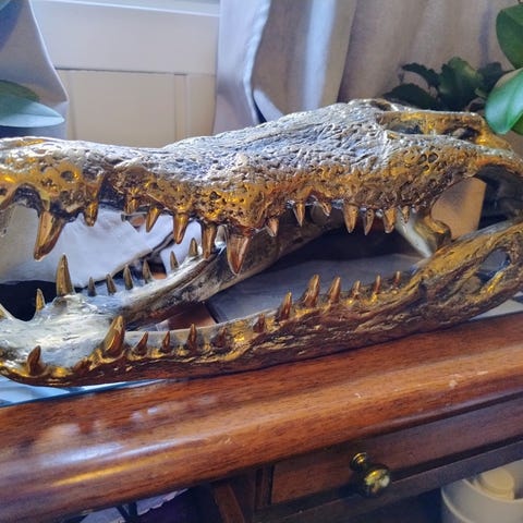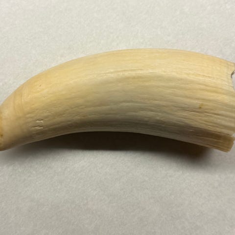 Tilstand: Tannen har en svært solid og tung rot, tydelig bourlette (det mørke båndet mellom rot og emalje), og bevarte sagtakker (serrations) langs kantene. Denne tannen har en nydelig fargekombinasjon og en størrelse som gjør den til et fantastisk blikkfang i en bokhylle eller utstillingsmonter. Gi bud