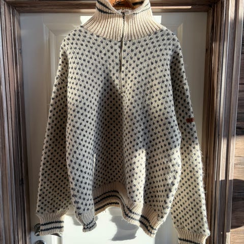 Lagret i klesskapet sammen med fleire handstrikka gensere. 60% ull og 40% rayon Produsert i Norge/Langevåg