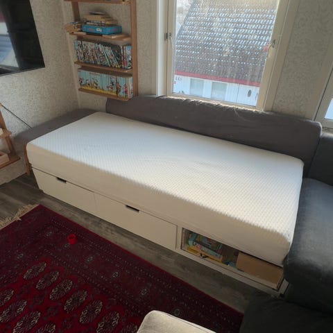 Selger en pent og lite brukt hvit IKEA 120 seng med hodegavl og en god og fin madrass🤍