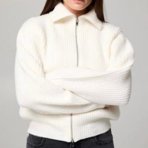 Myk og behagelig cardigan i kashmir og merinoull. Normal passform, toveis glidelås fra YKK og fine kontrastdetaljer. Lett, behagelig og varm jakke. Jakken har en fin offwhite farge med beige kontraster. Utsolgt i nettbutikk, ny pris 3300kr