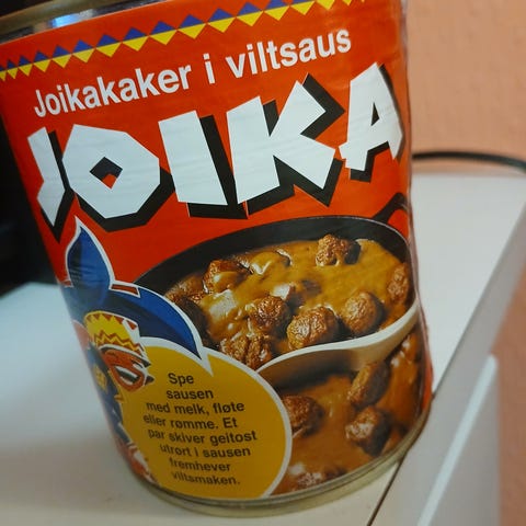 Nå har du muligheten til å sikre deg en matskatt. Og en historisk kuriositet. "Vintage" joikakaker i viltsaus hermetikk boks. Denne boksen er den tidligere versjon, før vi ble så woke at Joika ble forbudt. Og samegutten forsvant. Nå heter det Vilti. Men innholdet smaker like vondt. Best før-dato er juni 2025, men om du liker denne her retten og tenker den må i beredskapslageret ditt. Så er den sikkert holdbar i mange år til.
