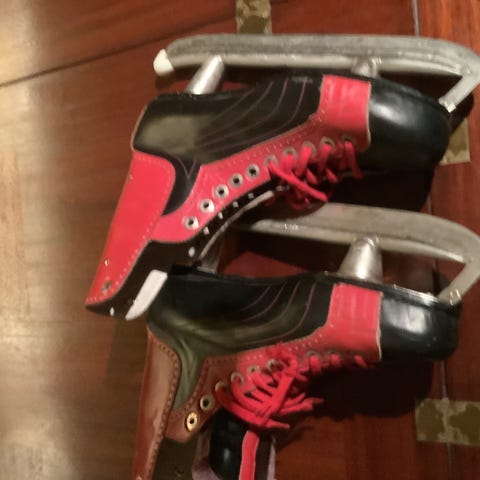 Ishockeyskøyter i størrelse 43. Skøytene har snøring foran og polstret ankelparti for støtte. Fargekombinasjon grå, svart og rød. Egnet til ishockey og generell bruk på is, for ungdom eller voksne med skostørrelse 43.