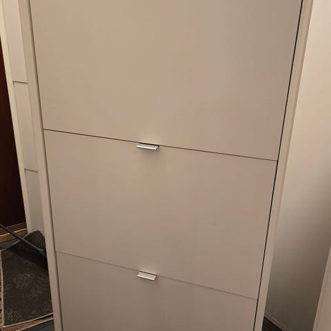 Nydelig solid skoskap i hvitt. Har to skoskuffer og en liten skuffe til ting. Det er nyvasket og fremstår som pent. Noen småmerker her og der, men ingen feil eller mangler.