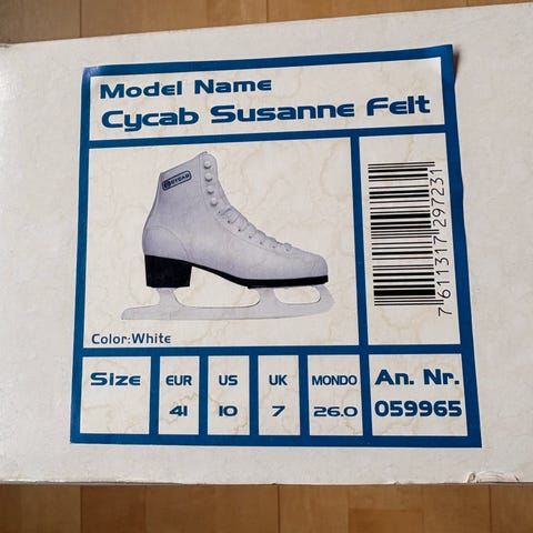 Ving Dansette skøyter i størrelse 41. Klassiske hvite skøyter i lær med snøring og stålklinge med tagger foran. Overdel i glatt lær med høy ankelstøtte og hæl. Passer til generell skøytebruk på isbane eller ute på is, for fritidsbruk eller enkel trening.
