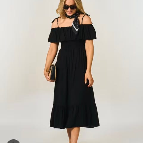 Betsey Johnson lang sommerkjole, blå stripet, dame XL. Kjolen er blå med stripet mønster og har flere volanger/nedfelte partier i skjørtet som gir et lett og luftig uttrykk. Ermene er ermeløse, og kjolen har fin v-utringning med knyting foran. Passer som sommerkjole eller til hverdagsbruk. Lett og behagelig stoff. Grati frakt