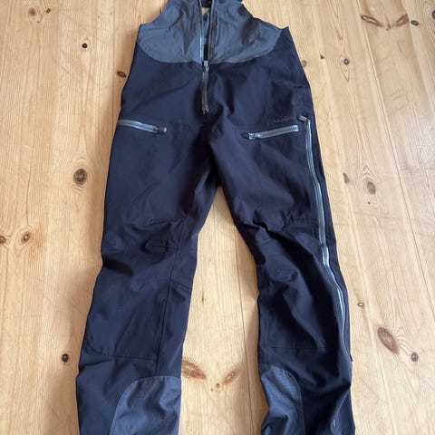 Buksen har høy, elastisk bib-del med justerbare seler og flere beltehemper i livet. Foran er det glidelåslukking med knapper, samt glidelåslommer på lårene. Bak finnes en glidelåslomme med Norrøna-logo. Buksen har formsydde knær og glidelåser langs bena for ventilasjon eller tilpasning over støvler. (Ny pris 2.999,-)
