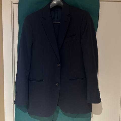 Marineblå, svakt pinstriped, 100% ull. Dress fra Cavour str. 46. Oppbrett bukse. Ermer lagt opp ca 1-2 cm hos skredder.