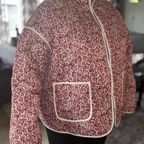 jakke for dame i størrelse XL. Jakken er beige og laget i polyester. Den har krage, lange ermer og knappelukking foran. Modellen er kort og rett i fasongen, med brystlommer med klaff. Passer som en lett hverdagsjakke.