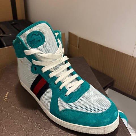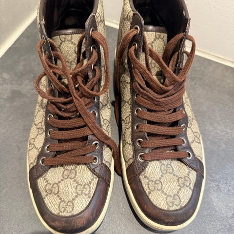 Selger et par stilige Gucci high-top sneakers i grønn farge. Skoene er lite brukt og i god stand, se bilder. Klassisk Gucci-logo på siden og premium skinn/semsket skinn. Komfortable og solide – perfekt både til hverdags og penere antrekk. 100% original