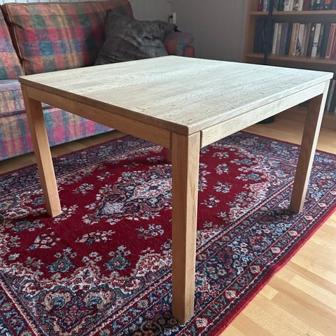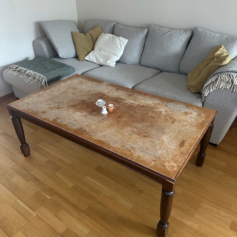 Hjørnebord i mørk eik selges. 400kr eller bud. Må hentes.