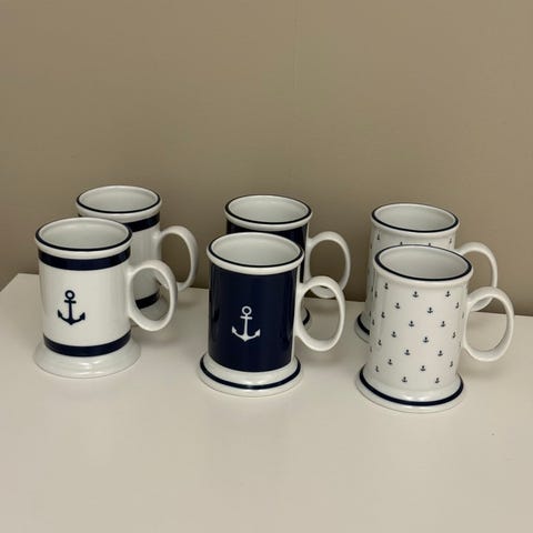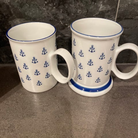 Flotte krus i hvitt porselen med maritimt anker-motiv, produsert av Porsgrund Porselænsfabrik. Klassisk og tidløst design som passer perfekt til kaffe, te eller kakao.