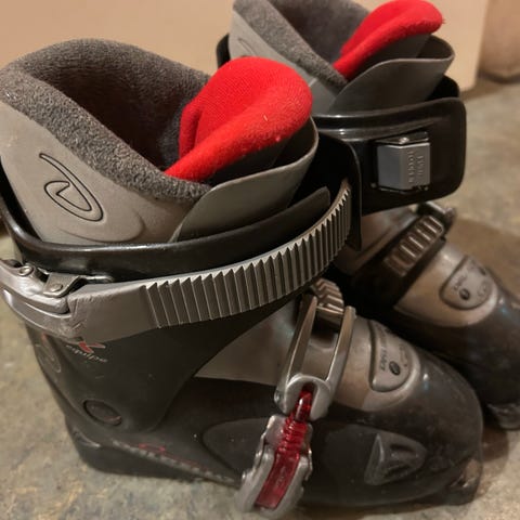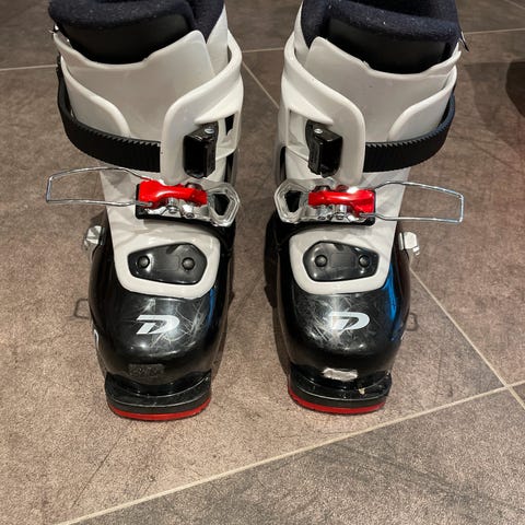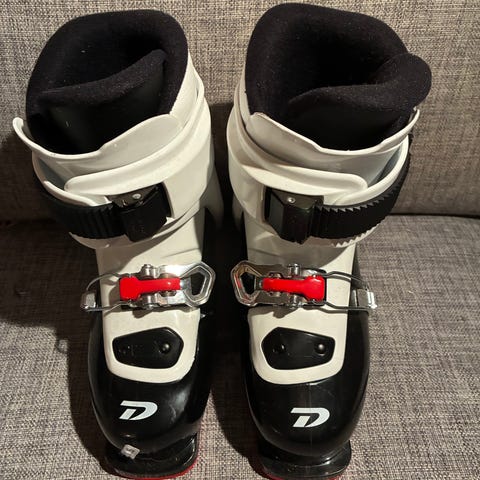 Pent brukte Dalbello alpinstøvler for barn, sorte med hvite og røde detaljer. Støvlene har to spenner foran for justering og god passform. Sålelengden er merket til 195 mm. Egnet til bruk med vanlige alpinbindinger for barn.