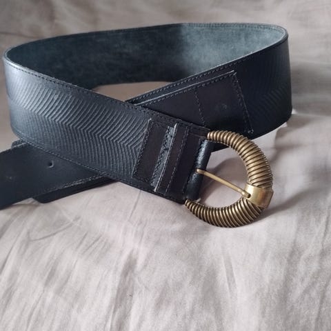 Belte for dame i lys beige farge med gullfarget metallspenne. Beltet har søm langs kantene og flere hull for justering av lengde. Passer til bruk i bukser, skjørt eller kjoler der det er beltehemper. Materialet ser ut som glatt kunstskinn eller lærimitasjon.