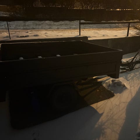 Tilhenger enakslet i metall med hvite sidekarmer. Hengeren har treverk i bunn, elektronikk virker, Ett hjul er punktert. Selges som den står.