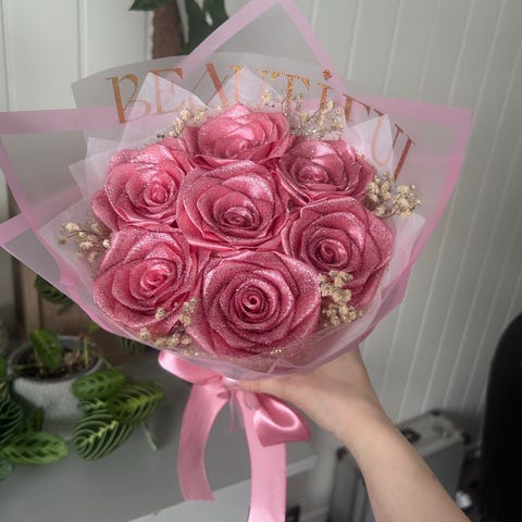 En rød rose, kjærlig laget til Valentinsdagen, er en kunstig rose i en pappeske med vakre fløyels- og satengbånd og utsøkte detaljer. Den kan leveres for hånd i Stovner eller Vestel, eller sendes hvis du betaler for frakt. Prisen er rimelig og billig med tanke på arbeidet og detaljene.