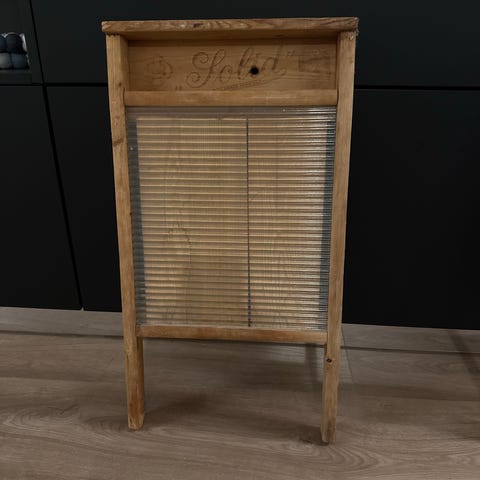 Vaskebrett i tradisjonell utførelse med ramme i tre og riflet flate i metall. Egnet som manuelt vaskeredskap til klær og tekstiler, eller som dekorativt innslag i interiør. Står på to bein og kan lene seg mot vegg eller kant av balje ved bruk.