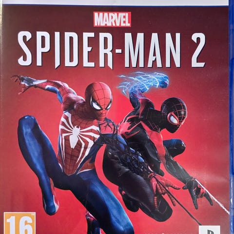 Marvel Spider-Man 2 Playstation 5 spill. Actioneventyrspill for PS5 med superheltkarakterene Spider-Man. Aldersgrense 16 år ifølge PEGI-merking. Fysisk utgave på disk for bruk med Playstation 5-konsoll.