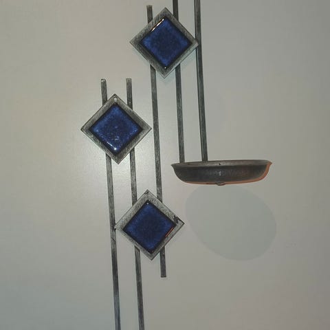 Skikkelig vintage lysestake fra 1970 - tallet i jern med blå keramikkfliser