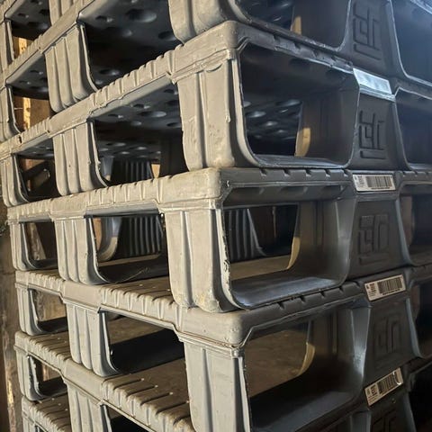 Hvite plastkasser stablet i høyde. Kassene er rektangulære og laget i hard plast, egnet for oppbevaring og transport av ulike varer. De kan stables oppå hverandre for plassbesparende lagring. Passer til bruk i lager, verksted, butikk eller annet miljø der det er behov for robuste oppbevaringskasser.