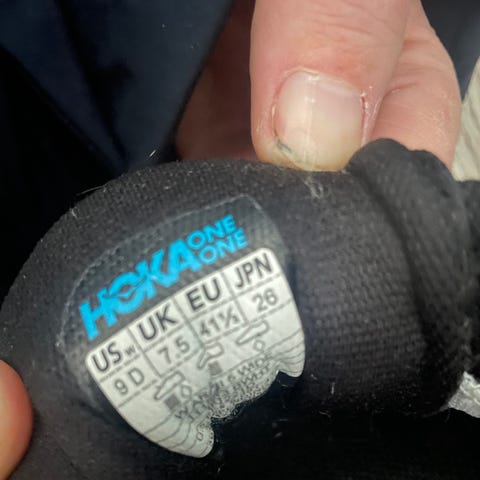 Hoka One One tursko i størrelse 42. Skoene er lave med kraftig yttersåle med grovt mønster som gir godt grep på variert underlag. Overdelen er i syntetisk materiale og mesh i gråtoner, med snøring foran og polstret hæl- og ankelparti for økt komfort. Egner seg til tur og fritidsbruk på sti og grusvei.