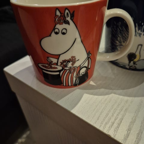 Arabia Mummi kopp i porselen med blå bakgrunn og Mummi-figurmotiv. Koppen har hank og lys innside. Egnet til varme og kalde drikker i hverdagsbruk eller som del av en Mummi-samling.