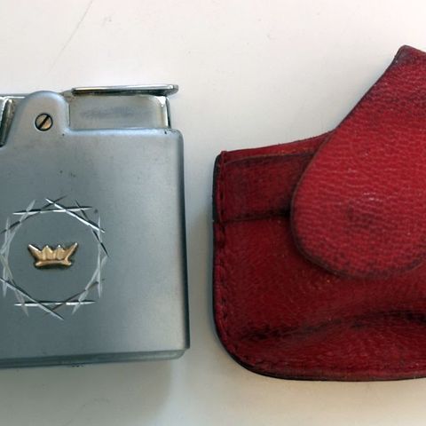 To sølvfargede gasslightere i metall med dekorert motiv på forsiden. Den ene har et krone-symbol i gullfarge omgitt av en sirkel, den andre har et mønster med tre buede former. Begge lighterne har topp i blank metall og ventil/tenner nederst. Egner seg som vanlige bord- eller lommelightere. Selges samlet som sett på to.