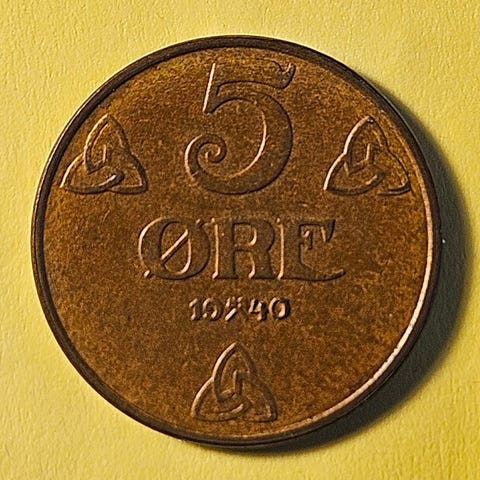 Norge 5 øre mynt. Rund kobberfarget mynt med valør 5 øre på den ene siden og norsk rikssymbol med krone på den andre siden.
