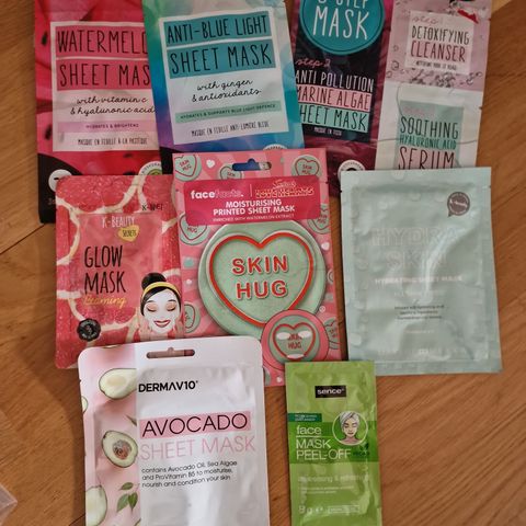 Sett med diverse hudpleieprodukter bestående av flere ansiktsmasker og to skrubbehansker i ulike farger. Inneholder blant annet sheetmasker og en flytende ansiktsmaske i pose. Skrubbehanskene kan brukes i dusj eller bad for mild peeling av huden. Produktene egner seg til enkel hudpleie i hjemmet.