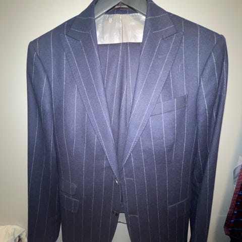 Jakke i str. 54 og bukse i str. 52. Stoff fra Vitale Barberis Canonico.