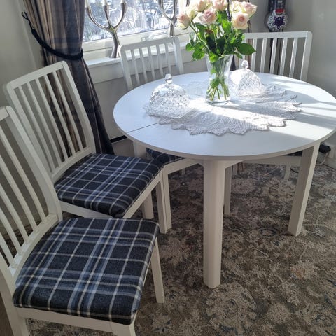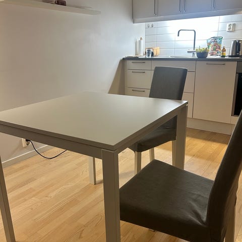 Bord og 5 x ikea stoler gis bort. Bordet har 2 skiver som kan settes i så det blir dobbelt så stort. Med skiver blir det 210 cm langt