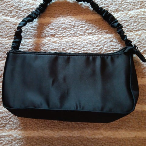 skulderveske laget av stoffmateriale i svart farge. har justerbar skulderrem og flere lommer for oppbevaring. Passer for unisex bruk.