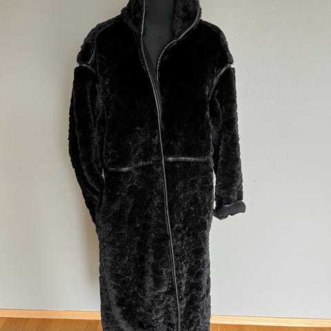 KappAhl kåpe i fuskepels for dame i størrelse M. Kåpen er lang og har rett passform med lange ermer. Den er laget i myk grå fuskepels og har krage og lukking foran. Egner seg som yttertøy i kjøligere vær.