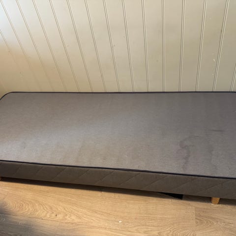 Seng og overmadrass av ukjent merke, grei stand. 75cm bred.