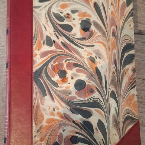 Vakkert privatinnbundet i rød skinnrygg med opphøyde bind og gullpreg. Marmorerte dekler med hjørneforsterkninger. Solid og gjennomført utførelse.
