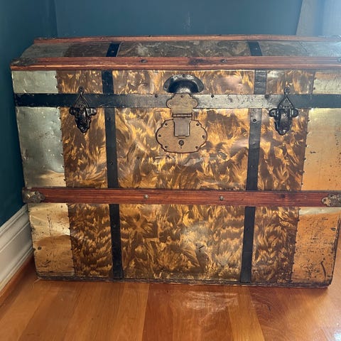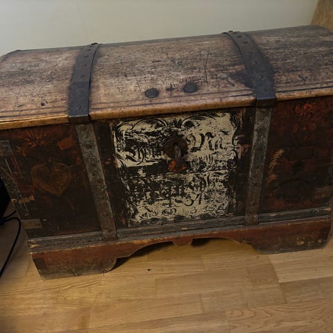 Trekiste i stor størrelse med buet lokk. Kisten er laget i tre med metallbeslag og håndtak på sidene. Innvendig er den ubehandlet/enkelt behandlet. Kisten har synlige bruksspor og slitasje i overflate og beslag, noe som gir et rustikt preg. Må hentes :) B: 86 cm H: ca40 cm D:36,5 cm.