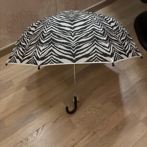 Dekorativ asiatisk papirparaply i brun og flerfarget design. Paraplyen har håndmalt motiv med figur- og landskapsdetaljer på utsiden, og tradisjonell ribbekonstruksjon i tre på innsiden. Skaftet er i tre, og paraplyen er egnet som innendørs dekorasjon eller rekvisitt. Passer for plassering i stue, gang eller andre rom der man ønsker et orientalsk preg i interiøret.Må hentes.
