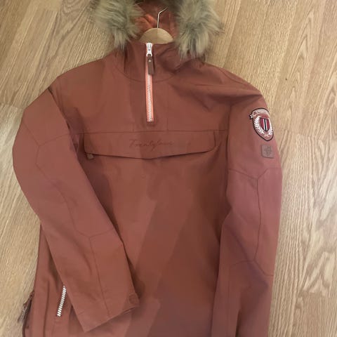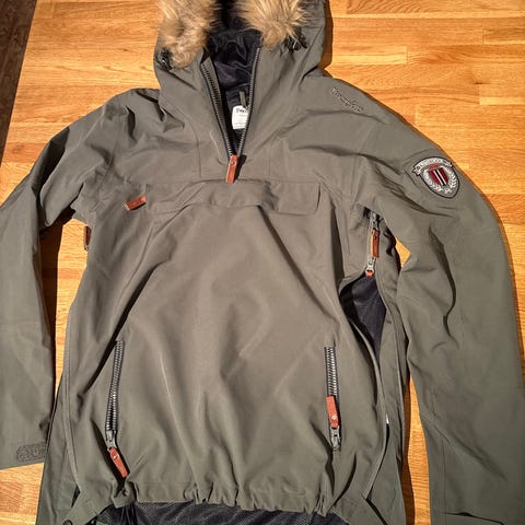 Nesten ikke brukt. Twentyfour anorakk jakke for barn i størrelse 152. Jakken er unisex og kommer i grønn farge. Materialet er polyester. Modellen har hette med avtagbar fuskepels, halv glidelås i front og sidelukning med glidelås og trykknapp. Det er stor kengurulomme foran samt sidelomme med glidelås. Ermene har rette avslutninger. Egner seg til hverdagsbruk og utendørsaktiviteter for barn i aktuell størrelse.